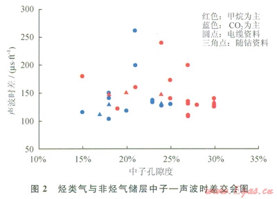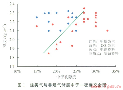 根據(jù)上述分析,采用交會(huì)圖技術(shù)研究了兩者在測(cè)井響應(yīng)上的差別。在樂東l5-122-1研究區(qū)選取了經(jīng)測(cè)試、電纜測(cè)試取樣或試生產(chǎn)證實(shí)含量相對(duì)比較高的甲烷或二氧化碳層段(1),并定義甲烷含量高于50%的氣層為以甲烷為主的氣層,否則為以非烴為主(CO2為主)的氣層,然后利用這些層段的測(cè)井資料分別作出了密度一中子、密度一聲波交會(huì)圖(1、2)。從圖l、2中可以看出:烴類氣與二氧化碳?xì)怏w在測(cè)井響應(yīng)值上是存在一定差別的,從而可以通過這種差異來區(qū)分烴類氣與二氧化碳?xì)鈱?sup>[10]。