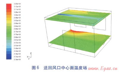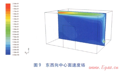 由圖3、4可知,靠近頂面的空氣溫度較低,且垂直方向溫度梯度較大,而距地面l.5m范圍內的垂直方向溫度梯度較小。由圖3、5可知,靠近外窗的空氣溫度較高,但水平方向上的溫度梯度并不大。
