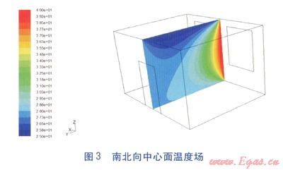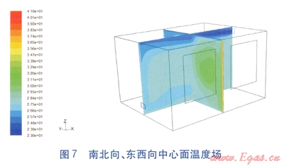 由于室內溫度場是三維場,因此選取其中最有代表性的3個切面進行分析:南北向及東西向的中心面、人員工作區(qū)距地面1.5m的平面。南北向中心面溫度場見圖3,南北向、東兩向中心面溫度場見圖4,1.5m高度處溫度場見圖5。