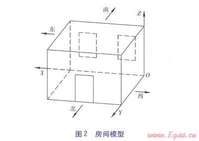 輻射部分為:頂面與室內非供冷表面之間的輻射換熱可簡化為一組灰體表面組成的傳熱模型,設定東側墻、北側墻、西側墻均為內墻,且物性參數(shù)相同,可將三者視為一個灰體表面。房間的其他表面:南側墻(外墻)、頂面、地面分別各自作為一個灰體表面。房間模型見圖2。