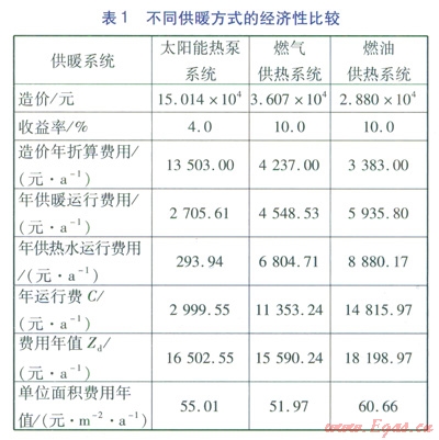 由表l可知,對于單位面積費用年值,太陽能熱泵系統(tǒng)比燃氣供熱系統(tǒng)高5.5%,比燃油供熱系統(tǒng)低10.3%。但是綜合考慮環(huán)境保護、能源消耗、系統(tǒng)可調(diào)性和長期回報,太陽能熱泵低溫輻射供暖系統(tǒng)還是具有較大的市場潛力。