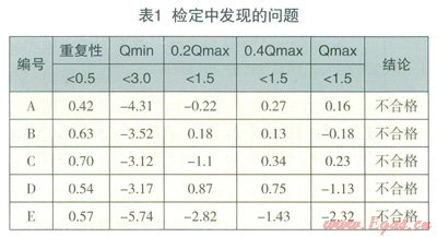 一批準(zhǔn)確度等級(jí)為l.5級(jí)的腰輪流量計(jì)經(jīng)維修組裝完成后,沒有通過模擬運(yùn)行工作臺(tái)跑活,送往檢測(cè)中心進(jìn)行檢定,檢定結(jié)果顯示,其中5臺(tái)表具的重復(fù)性和點(diǎn)誤差數(shù)據(jù)不合格(1)