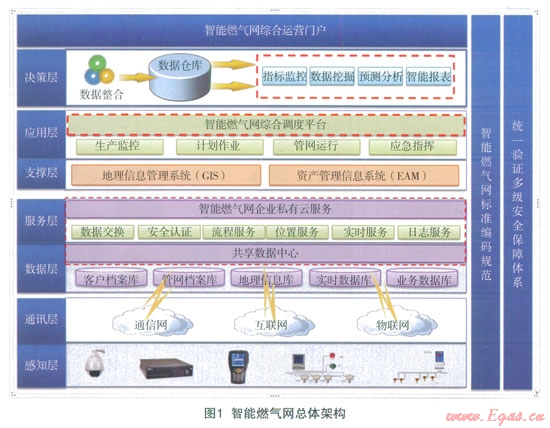 “智能燃?xì)饩W(wǎng)”涵蓋的內(nèi)容非常廣泛,包含廣泛的物聯(lián)網(wǎng)感知體系,有線、無(wú)線、自組等多樣化的網(wǎng)絡(luò)通訊體系,基于共享數(shù)據(jù)中心的,能夠?yàn)槿髽I(yè)提供數(shù)據(jù)和業(yè)務(wù)服務(wù)的“企業(yè)私有云”體系,融合管網(wǎng)完整性管理、生產(chǎn)調(diào)度管理、應(yīng)急指揮管理、客戶關(guān)系管理等核心業(yè)務(wù)的企業(yè)運(yùn)營(yíng)標(biāo)準(zhǔn)化體系,頂層應(yīng)用數(shù)據(jù)倉(cāng)庫(kù)、數(shù)據(jù)挖掘的決策分析體系等等。圖l是智能燃?xì)饩W(wǎng)建設(shè)總體架構(gòu)。