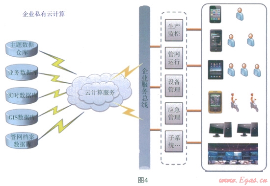 數(shù)據(jù)的集成最終是為了數(shù)據(jù)的有效利用和業(yè)務(wù)的集成,智能燃?xì)饩W(wǎng)企業(yè)私有云需要完成云計(jì)算PAAS層研發(fā)建設(shè)工作(IAAS層由于GIS數(shù)據(jù)和實(shí)時(shí)數(shù)據(jù)庫(kù)的相對(duì)獨(dú)立以及專業(yè)性,并不需要在硬件層面上完全虛擬化構(gòu)建),為業(yè)務(wù)系統(tǒng)提供各類標(biāo)準(zhǔn)化計(jì)算與服務(wù),如圖4所示。