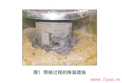 在焊接Fitting過程中,溫度監(jiān)控及降溫措施尤為重要。焊接時,在焊縫周邊至少連接4個感應(yīng)器對溫度進(jìn)行測量監(jiān)控,并進(jìn)行相應(yīng)的降溫措施,比如覆蓋含水量適中的粘土或液體冷卻袋于焊接處周邊,有效阻止降低焊接溫度在母管上的傳導(dǎo)。運(yùn)用不同廠家生產(chǎn)的內(nèi)襯材料,感應(yīng)器與焊縫間、降溫物質(zhì)與焊縫間的距離設(shè)置各不相同,通過溫度感應(yīng)器測量得到的最高允許溫度值也不同。