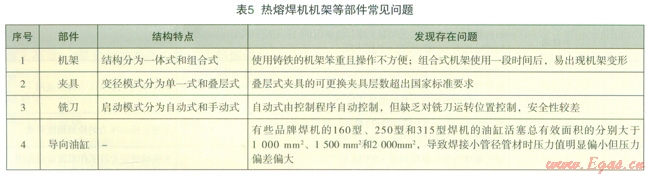 5為檢測中常見的熱熔焊機(jī)機(jī)架、夾具、銑刀和導(dǎo)向油缸等部件存在的問題。從表中可以看出,出現(xiàn)的問題主要與制造廠家的設(shè)計(jì)和使用材料有關(guān)。