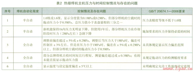 2是檢測結(jié)果中常見的熱熔焊機(jī)主機(jī)的控制壓力和溫度性能中存在的問題。從表中可看出不少半自動(dòng)型焊機(jī)的壓力表精度等級明顯低于同家標(biāo)準(zhǔn)[12]要求,并且存在保壓能力不足的問題。這表明焊機(jī)的控壓系統(tǒng)元件的等級不符合要求且性能易發(fā)生劣化。對于全自型焊機(jī),由于國家標(biāo)準(zhǔn)對全自動(dòng)熱熔焊機(jī)的壓力控制精度和工作溫度控制精度缺乏明確的規(guī)定,大部分焊機(jī)的壓力和溫度控制情況差異很大,且存在不少焊機(jī)的壓力與溫度控制偏差很大。