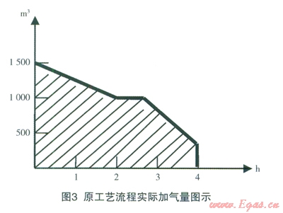 改進(jìn)工藝流程平均加氣量圖示:上部為管束氣瓶直接加入CNG汽車(chē)天然氣氣量,下部為經(jīng)壓縮機(jī)壓縮的加氣量;改進(jìn)工藝流程后加氣量由1000m3/h增加到1500m3/h;一輛管束車(chē)卸氣時(shí)間由原4h/車(chē)縮短到3h/車(chē)以?xún)?nèi);改進(jìn)工藝流程后相對(duì)減少了壓縮機(jī)開(kāi)機(jī)時(shí)間,減少了壓縮機(jī)的磨損并降低了能耗,實(shí)現(xiàn)了壓縮機(jī)在原有排氣量不變情況下提高加氣量的目的。