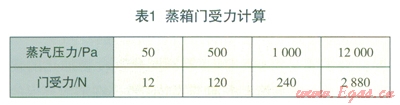 每個(gè)蒸腔門的受力面積假設(shè)為300mm-800mm=0.24m2,計(jì)算結(jié)果見表1。