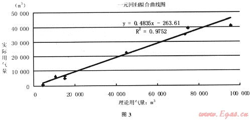 理論用氣量與實際用氣量的相關系數(shù)r=0.988,線性關系顯著。一元回歸方程為y=0.4835x-263.61,擬合度曲線如圖3。