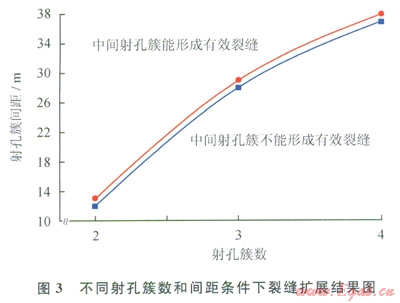 假設(shè)中間射孔簇形成的壓裂裂縫長度達到兩端裂縫的一半以上,認為中間裂縫形成了有效裂縫。不同射孔簇數(shù)、簇間距條件下的裂縫擴展情況如圖3所示,從圖3可以看出:射孔簇數(shù)增加,能形成有效裂縫的極限間距增加,且增加幅度較大;射孔簇數(shù)為2簇,極限干擾距離為13.0m;射孔簇數(shù)增加到4簇,極限十擾距離增加到38.0m