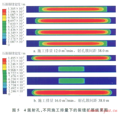 5所示的是4簇射孔、射孔簇間距為38.0m,施工排量分別為l2.0m3rainl6.0m3min時的裂縫擴展情況,施工排量增大4.0m3min,中間裂縫的長度發(fā)生了明顯變化;施工排量為l6.0m3min、4簇射孔條件下,中間射孔簇?zé)o法形成有效裂縫。
