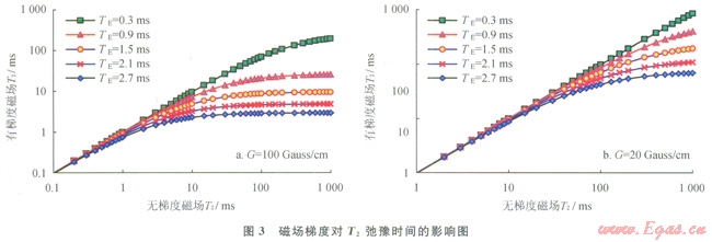 對(duì)比模擬的兩種大小的內(nèi)部梯度磁場(chǎng)對(duì)T2譜影響的成果圖可看出(3):相同回波間隔下,內(nèi)部磁場(chǎng)梯度越強(qiáng),相同弛豫組分對(duì)應(yīng)的T2譜時(shí)間越短,意味著T2譜前移越明顯,使其向弛豫時(shí)間變短的方向移動(dòng)。