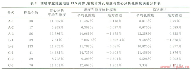 密度測(cè)井反映的是儀器探測(cè)范圍內(nèi)地層的總密度,能有效反映地層的總孔隙度,對(duì)各種類型的孔隙度都能有效反映,如火成巖地層中大的氣孔、溶蝕孔洞空隙都能反映。采用巖心刻度測(cè)井的方法,分區(qū)塊、分巖性建立了不同區(qū)塊、不同巖性的密度測(cè)井與巖心分析孔隙度間的線性回歸模型用于計(jì)算火成巖儲(chǔ)層的孔隙度,實(shí)際應(yīng)用表明,利用密度曲線計(jì)算的孔隙度與巖心分析孔隙度之間的誤差較小(2)