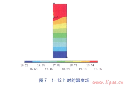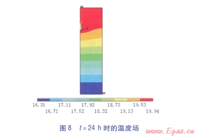 通過有限元軟件模擬了管道氣密性試驗(yàn)過程24h內(nèi)的溫度場分布,不同時(shí)刻的溫度場分布見圖38,t為模擬的時(shí)間,云圖下方彩色標(biāo)尺的顏色深淺表示溫度的高低,數(shù)值表示溫度值,單位為℃。