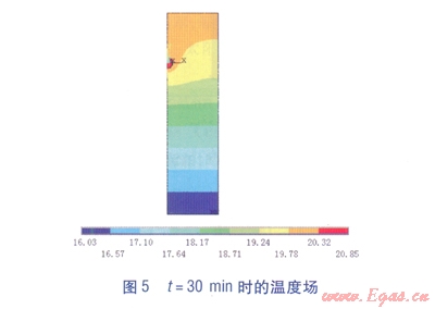運(yùn)用有限元軟件ANSYS的熱分析功能,模擬得到了埋地管道氣密性試驗(yàn)過程中溫度場隨時(shí)間的變化情況:試驗(yàn)開始階段,管道溫度下降較快,30min后,管道溫度下降速度減緩,經(jīng)過1.5h后,管內(nèi)外溫度場基本達(dá)到穩(wěn)定。