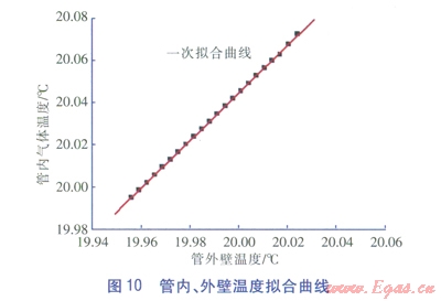 由圖9中傳熱進(jìn)行到60min后管道中心與管外壁的溫度曲線可以看出,當(dāng)傳熱達(dá)到穩(wěn)定時(shí),管內(nèi)溫度與管外壁溫度曲線接近重合,管內(nèi)溫度略高于管外壁溫度。取溫度場達(dá)到穩(wěn)定(1.5h)后的管內(nèi)、管外壁溫度數(shù)據(jù)進(jìn)行擬合,得到管內(nèi)和管外壁溫度的擬合曲線(見圖l0),其關(guān)系式見式(4)。圖l0中,黑點(diǎn)為模擬得到的管內(nèi)和管外壁溫度數(shù)據(jù)點(diǎn),紅線為一次擬合曲線。由圖10可以看出,埋地管道溫度場達(dá)到穩(wěn)定后,管內(nèi)溫度和管外壁溫度的溫差均小于0.1℃,與試驗(yàn)所獲得的數(shù)據(jù)基本符合(見表2)。