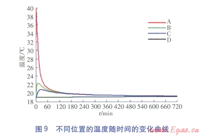 分別取管道中心A、管道外壁B、水平方向距管道0.1m處土壤C及水平方向距管道0.5m處土壤D4個(gè)點(diǎn),得到各點(diǎn)處溫度隨時(shí)間的變化曲線,見圖9。