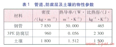 以規(guī)格為Æ219×620號(hào)鋼管為例進(jìn)行計(jì)算,采用3PE防腐,防腐層厚度為2mm,埋地深度h11m。管道、防腐層及土壤的物性參數(shù)經(jīng)現(xiàn)場測量,結(jié)果見表1。