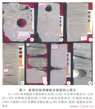 崖城l3-1氣田的其他鉆井具有同樣的沉積特征(圖3-c、3-d、3-e),與SS4井緊鄰的SS5井崖三段也有類似特點(diǎn)(圖3-f)。位于SS5井南部的SS6井崖三段下部為灰白色砂巖夾灰色、深灰色泥巖,往上為灰白色砂巖與灰色泥巖的互層,見(jiàn)清晰的反映潮汐作用的透鏡狀層理、脈狀層理與波狀層理(圖3-g),蟲孔發(fā)育,代表水體加深、受潮汐影響變強(qiáng),該部位主要的成煤環(huán)境為潮坪的潮上帶。而位于崖南凹陷南部崖南低凸起的SS7井,其崖城組下部以淺灰色粗砂巖夾薄層灰黑色泥巖為主,上部為深灰色泥巖夾薄層淺灰色細(xì)砂巖或兩者的互層,見(jiàn)豐度不等的有孔蟲、鈣質(zhì)超微化石,有孔蟲以近岸底棲種群為主,主要粒徑大于0.125mm,早期浮游有孔蟲也具較高濃度,豐度為30~400枚/50g,并伴有少量共生的淺海介形蟲,見(jiàn)粒面球藻、瘤面球藻、褶皺藻等孢粉化石,反映沉積時(shí)期為濱?;蚴芟薜臏\海環(huán)境,主要的烴源巖形成環(huán)境為淺海。