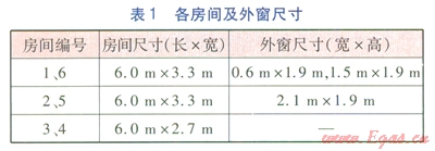 以天津市某住宅小區(qū)建筑為例,該建筑為一梯兩戶的l5層板樓,層高為3m。典型層的房間平面布置見圖1,東側(cè)住戶建筑面積為l33.03m2,西側(cè)住戶建筑面積為132.07m2。各房間及外窗尺寸見表1,圍護(hù)結(jié)構(gòu)熱工性能參數(shù)見表2。