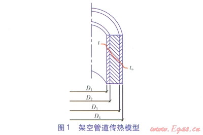 架空敷設(shè)熱水供熱管道(以下簡(jiǎn)稱架空管道,由工作鋼管、保溫層、保護(hù)層構(gòu)成)傳熱模型見(jiàn)圖l,單位長(zhǎng)度架空管道熱損失q的計(jì)算式為[1]: