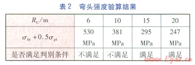 當(dāng)彎頭的計(jì)算曲率半徑RC分別取6、10、15、20m時(shí),由式(9)(17)得到的彎頭強(qiáng)度驗(yàn)算結(jié)果見表2.充分考慮安全余量,彎頭的曲率半徑宜選取20m。