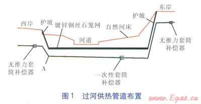 過河供熱管道的布置見圖1。為減少管網(wǎng)中補(bǔ)償器數(shù)量,降低泄漏的危險(xiǎn),該工程選用直埋無補(bǔ)償敷設(shè)。直埋無補(bǔ)償敷設(shè)分為冷安裝、預(yù)應(yīng)力安裝方式,其中預(yù)應(yīng)力安裝方式可分為預(yù)熱安裝、一次性補(bǔ)償器安裝方式[1-2]。對于分支較少,地下障礙較少,地勢平坦,地質(zhì)條件較好的熱水供熱系統(tǒng),推薦采用冷安裝方式。而該工程地形復(fù)雜,起伏大,地質(zhì)條件不佳,加之管徑較大,易出現(xiàn)局部失穩(wěn)。若采用冷安裝方式,難度大、成本高,因此我們決定采用預(yù)熱安裝方式。在管道中設(shè)置一次性補(bǔ)償器,管道焊接后,除一次性補(bǔ)償器附近管溝外,其他管溝立即回填。在首次加熱過程中,當(dāng)一次性補(bǔ)償器的補(bǔ)償量達(dá)到補(bǔ)償管段所要提前釋放的熱膨脹量時(shí),把一次性補(bǔ)償器焊死,完成管道的整體焊接。