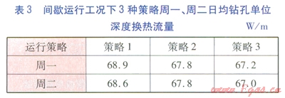 間歇運行工況下3種策略周一、周二日均鉆孔單位深度換熱流量見表3。由表3可知,與連續(xù)運行工況相比,間歇運行工況3種策略的地埋管換熱器換熱能力均有所改善。策略1、2的地埋管換熱器換熱能力優(yōu)于策略3,這表明地埋管換熱器停運時間越長,越有助于改善其換熱能力。策略l、2均為全天運行6h,但策略l的地埋管換熱器換熱能力卻高于策略2。這說明,在一段時間內,采取相對分散的土壤溫度恢復時間比采取相對集中的土壤溫度恢復時間效果更好。