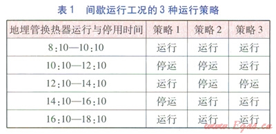 采用恒定地埋管換熱器進水溫度的方法,實驗模擬夏季工況下地埋管換熱器在連續(xù)運行工況、間歇運行工況下的換熱能力。對于連續(xù)運行工況,地埋管換熱器在周一至周五的8:10—l8:10連續(xù)運行,其他時間停用。對于間歇運行工況,地埋管換熱器在周一至周五的8:10—18:10間歇運行,其他時間停用,并設計了3種運行策略(見表l)。