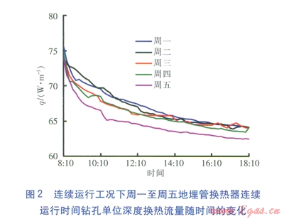 連續(xù)運行工況下,周一至周五地埋管換熱器連續(xù)運行時間鉆孔單位深度換熱流量隨時間的變化見圖2。由圖2可知,隨著時間推移,鉆孔單位深度換熱流量整體呈下降趨勢,雖然周一二這種變化并不明顯,但從周三開始,特別是周五,地埋管換熱器的換熱能力已有明顯降低。前一日運行結束時的鉆孔單位深度換熱流量較低,但次日基本能恢復至前一日開始運行時的水平。周一至周五日均鉆孔單位深度換熱流量見表2。由表2可知,經過5d的連續(xù)運行,鉆孔單位深度換熱流量從67.1W/m下降至64.8W/m,下降幅度為3.4%。