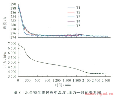 為進(jìn)一步考察模擬實(shí)驗(yàn)系統(tǒng)的工作情況,進(jìn)行了甲烷原位成藏過(guò)程的模擬實(shí)驗(yàn)。用分析純氯化鈉和玄離子水配置質(zhì)量濃度為3.35%的鹽水,并與40-80目石英砂在釜中混合以模擬含水飽和度為0.95的沉積層。反應(yīng)釜密封抽真空后由頂部通入甲烷至7MPa,制冷溫度設(shè)定為275K并保持恒定。實(shí)驗(yàn)共持續(xù)50h,記錄實(shí)驗(yàn)過(guò)程中的溫度、壓力隨時(shí)間變化情況如圖8所示。