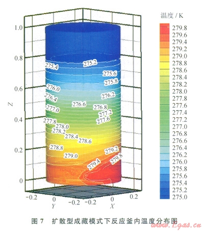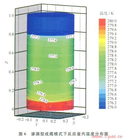 滲漏型成藏模式中,游離甲烷氣以0.1gs的流速自底部進(jìn)氣口進(jìn)入反應(yīng)釜內(nèi),并迅速擴(kuò)散至整個(gè)底部氣囊(0100mm高度區(qū)間)。經(jīng)過(guò)氣囊緩沖,氣體的流速顯著降低。由于氣體熱容較低,當(dāng)氣體離開(kāi)底部氣囊滲流進(jìn)入沉積層時(shí),溫度已被U型管加熱至280K。因此,在沉積層底部靠近氣囊的區(qū)域,傳熱方式為甲烷氣與沉積層顆粒之間對(duì)流傳熱和底部氣囊與沉積層整體之間的導(dǎo)熱。隨著甲烷氣在滲流過(guò)程中溫度迅速降低,對(duì)流傳熱作用減小,導(dǎo)熱逐漸成為主要傳熱方式。因此,在圖6中沉積層區(qū)域底部的等溫線受滲流影響有明顯的起伏,而隨著位置的升高,起伏現(xiàn)象逐漸消失,等溫線與底面平行。沉積層整體高度為700mm,底面的溫度為278.8K,頂層溫度為276K,整體溫差2.8K,溫度梯度折合為4Km,與表1中凍土帶水合物藏地溫梯度符合ll00的比例,略小于海底水合物藏溫度梯度,但也可通過(guò)改變給熱溫度加以修正。
