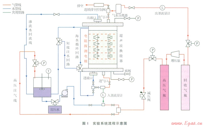 2)根據(jù)設(shè)計(jì)方案,建立了物模實(shí)驗(yàn)系統(tǒng)。高壓反應(yīng)釜容積為196L,耐壓32MPa,內(nèi)置30個(gè)PTl00A溫度傳感器,30個(gè)電阻率探測(cè)電極,16對(duì)聲偶極子。系統(tǒng)可在典型水合物藏溫壓條件下模擬不同甲烷供氣方式,考察水合物的動(dòng)態(tài)生成過(guò)程以及新鮮海水循環(huán)下的水合物動(dòng)態(tài)演化行為。