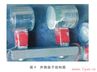 沉積層的聲速測(cè)量采用聲偶極子進(jìn)行,結(jié)構(gòu)如圖5所示。聲偶極子由中國(guó)科學(xué)院地質(zhì)與地球物理研究所提供,2只間距為30mm的超聲波換能器由底部的夾板固定,中間填入含水砂凍結(jié)后再埋入沉積層中。由美國(guó)泛美元損檢測(cè)公司生產(chǎn)的NDTS058PR型發(fā)生器發(fā)射脈沖信號(hào),通過(guò)一端換能器轉(zhuǎn)換為超聲波,穿過(guò)所夾持介質(zhì)后由另一端換能器接收,由美國(guó)泰克公司生產(chǎn)的DP02012型示波器顯示分析得到介質(zhì)聲速。