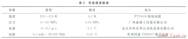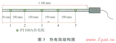 子系統(tǒng)包括溫度、壓力、流量、電阻率、聲速5項(xiàng)參數(shù)的采集與處理,各傳感器參數(shù)見(jiàn)表2。其中,溫度傳感器采用集成鎧裝形式,5個(gè)PTl00A級(jí)鉑電阻裝入l316LÆ6mm鋼管中,結(jié)構(gòu)如圖3所示。