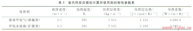 為了驗(yàn)證實(shí)驗(yàn)條件下通過(guò)U型加熱盤管是否能獲得類似自然條件下的地溫梯度,針對(duì)滲漏、擴(kuò)散兩種成藏方式,利用Fluent軟件對(duì)釜內(nèi)的溫度分布進(jìn)行了模擬計(jì)算,計(jì)算所用到的物性參數(shù)列于表3。流體紅275K下進(jìn)入反應(yīng)釜,經(jīng)過(guò)U型加熱盤管換熱后,流經(jīng)石英砂構(gòu)成的孔隙率為0.38的沉積層,由頂部的出口流出反應(yīng)釜。平衡后的溫度分布如圖6所示。