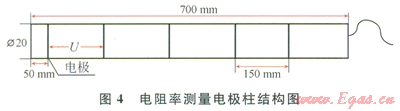 電阻率測(cè)量電極柱為自行設(shè)計(jì),尺寸Æ20mm×700mm(4)。電極柱桿體材質(zhì)選用聚四氟乙烯,5根鍍銀銅導(dǎo)線在桿體上環(huán)繞一周形成5個(gè)環(huán)狀測(cè)量電極,相鄰環(huán)狀電極間距l50mm。將相鄰2個(gè)環(huán)狀電極接入電路,即可測(cè)量環(huán)狀電極間所夾介質(zhì)的電阻,進(jìn)而可換算出所夾介質(zhì)的電阻率。系統(tǒng)共配備有這樣的測(cè)量電極柱6根,共30路測(cè)量電極,可測(cè)量24路電阻率數(shù)據(jù)。