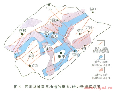 從重力、磁力處理結(jié)果的構(gòu)造解譯看,四川盆地深層構(gòu)造復(fù)雜,基底構(gòu)造形跡總體表現(xiàn)為NE向?;讛嗔岩?span lang="EN-US">NE向?yàn)橹?,?guī)模最大的有華鎣山斷裂和龍泉山基底斷裂;川中地區(qū)發(fā)育Nw向基底斷裂,但多數(shù)受限于華鎣山斷裂和龍泉山基底斷裂之間(6)。通過(guò)對(duì)剩余重力異常、磁異常處理,突出深、淺部巖石磁性特征。以切割半徑為5km2層切割剩余磁異常,向上延拓5km、10km、40km。結(jié)果表明,在綿陽(yáng)、南充、大足、石柱等存在高磁異常,是盆地內(nèi)基性火山巖的響應(yīng),且緊鄰基底斷裂。對(duì)布格重力異常進(jìn)行切割半徑為5km1層切割法,求取剩余異常與區(qū)域異常。結(jié)果表明,除大足重力高之外,剩余重力異常呈NE向緊鄰磁異常高分布。結(jié)合巖性分析,認(rèn)為結(jié)晶基底及花崗巖基底表現(xiàn)為弱異常、高重力異常;巨厚的沉積巖表現(xiàn)為弱磁異常及低重力異常;中—基性火山巖表現(xiàn)為高磁異常、中等剩余重力異常。依據(jù)上述信息,推測(cè)四川盆地深層存在裂谷盆地,總體表現(xiàn)為NE向展布,且受基底斷裂控制。裂谷兩側(cè)發(fā)育斷裂與基性火山巖伴生,可能是裂谷初期火山活動(dòng)的表現(xiàn)。根據(jù)區(qū)域資料推測(cè),這套中一基性火山巖可能與川西—滇中裂谷充填的巨厚蘇雄組及川中女基井鉆遇的蘇雄組火山巖為同期產(chǎn)物距今時(shí)間介于803760Ma之間。而緊鄰火山巖分布為裂谷沉積物充填,表現(xiàn)為重力低值區(qū)。需要指出,在重慶、涪陵、南充、遂寧一帶,存在受NW向斷裂控制的裂谷發(fā)育區(qū),在地震剖面上有較清楚的反射特征響應(yīng),尤其是遂寧大足之間的基底斷裂在地震反射剖面上響應(yīng)特征更為明顯。