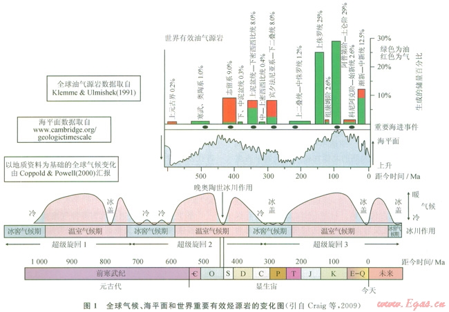 從烴源巖分布的角度考慮,不同時(shí)代全球氣候、海平而和源巖分布之間存在較好的對(duì)應(yīng)關(guān)系。Craig等人[1]研究距今l000Ma以來(lái)全球氣候變化、海平面和世界主要有效油氣源巖時(shí)代分布的對(duì)應(yīng)關(guān)系(1),指出高海平面期對(duì)應(yīng)于溫室氣候期,冰川融化導(dǎo)致海平面上升,有利于富有機(jī)質(zhì)沉積物堆積,是世界許多重要油氣源巖沉積的主要時(shí)期。如北非,志留系底部發(fā)育后冰川期烴源巖,直接覆蓋在上奧陶統(tǒng)儲(chǔ)層系之上,古生界含油氣系統(tǒng)的總儲(chǔ)量約為500×108桶油當(dāng)量[2]