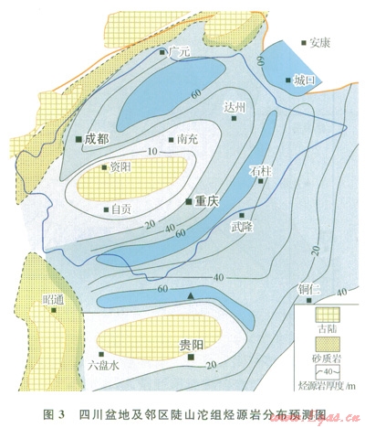 四川盆地腹部?jī)H有少量鉆井鉆遇該層系,且厚度薄,因而這套烴源巖在盆地分布往往不被看好。近期,筆者根據(jù)盆地區(qū)域地震的層位解釋,發(fā)現(xiàn)燈影組底界以下的反射層具有向古隆起超覆沉積的特征,層位應(yīng)歸屬陡山沱組。這表明陡山沱沉積期,上揚(yáng)子地區(qū)存在兩個(gè)同沉積期古隆起,分別是黔中隆起和樂(lè)山—龍女寺古隆起陡山沱組烴源巖在古坳陷區(qū)厚度較大,而隆起區(qū)厚度明顯減薄。圖3是筆者根據(jù)地震解釋結(jié)合露頭剖而資料推測(cè)的陡山沱組烴源巖分布圖。從圖3可以看出,資陽(yáng)古隆起兩側(cè)的川西、川東地區(qū)均存在陡山沱組烴源巖,厚度在2060m。這一認(rèn)識(shí)大大提升了震旦系含油氣系統(tǒng)的資源潛力。