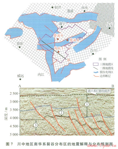 根據(jù)對(duì)川中地區(qū)震旦系燈影組以下層位的地震反射特征解釋,可以進(jìn)一步識(shí)別出裂谷形態(tài)及分布特征。圖7可以看出在南充—遂寧之間、磨溪地區(qū)存在近東西向裂谷,而高石梯以西存在近南北向裂谷。根據(jù)3D地震反射特征,可以將裂谷區(qū)充填地層劃分為3的反射層組(7)反射層組為較連續(xù)反射,成層性好,厚度變化較大,地震反射時(shí)間介于6001300ms;②反射層組為斷續(xù)反射,底界反射波組連續(xù)性較強(qiáng),可能是某個(gè)地層界面的反射特征;③反射層組為雜亂反射。從解釋的斷裂來(lái)看,既有正斷層也有逆斷層,反映裂谷區(qū)經(jīng)歷了復(fù)雜的構(gòu)造演化歷史。當(dāng)然,區(qū)內(nèi)的地震解釋方案尚沒(méi)有得到鉆井證實(shí),有待進(jìn)一步深化研究。