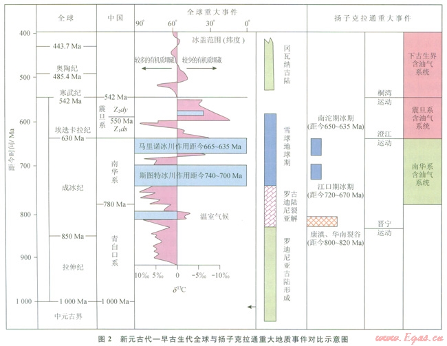 新元古代到早寒武世時(shí)期,全球發(fā)生了一系列重大地質(zhì)事件[13-18]羅迪(Rodinia)超級(jí)古陸的形成、穩(wěn)定和初始破裂,發(fā)生在距今大約750Ma前的拉伸紀(jì)至早成冰世;②全球性冰川作用,發(fā)生在中成冰世至早埃迭卡拉世階段(距今750600Ma),包括兩次重大冰川作用,斯圖特冰川作用和馬里諾冰川作用;③岡瓦納超級(jí)古陸的形成和穩(wěn)定,發(fā)生在中埃迭卡拉世至早寒武世階段(距今約600Ma以后)