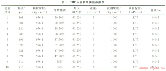 王武昌等[11]對(duì)四氫呋喃(THF)水合物在水平管道中的流動(dòng)狀態(tài)進(jìn)行了大量實(shí)驗(yàn)研究(1),研究?jī)?nèi)容包括顆粒粒徑、濃度以及流速等對(duì)水合物漿流動(dòng)狀態(tài)的影響,筆者以其實(shí)驗(yàn)數(shù)據(jù)為參照,對(duì)模型計(jì)算結(jié)果進(jìn)行了對(duì)比。