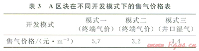 經(jīng)濟(jì)評(píng)價(jià)模型中計(jì)算了3種開(kāi)發(fā)模式:水下井口+綜合處理平臺(tái)+水下管道+陸上終端;水下井口+綜合處理平臺(tái)+租用其他公司管道;水下井口+FLNG裝置。在模式中,由于FLNG的成本回收期設(shè)計(jì)為25年,對(duì)于此類(lèi)0.5TCF及其以下規(guī)模氣田,在A區(qū)塊生產(chǎn)8年后需尋找其他類(lèi)似規(guī)模氣田接替生產(chǎn)l7年,若接替氣田儲(chǔ)量更加優(yōu)質(zhì),將縮短接替年限或獲得更高的收益。在A區(qū)塊的8年經(jīng)濟(jì)年限中,若實(shí)現(xiàn)10%的內(nèi)部收益,采用不同開(kāi)發(fā)模式所獲得的上游售氣價(jià)格見(jiàn)表3