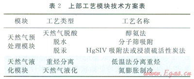 FLNG上部工藝模塊主要由天然氣進(jìn)氣模塊、天然氣預(yù)處理模塊、天然氣分餾模塊、天然氣液化模塊、BOG處理模塊、產(chǎn)品儲(chǔ)存和卸料系統(tǒng)、公共工程模塊、火炬和壓力釋放系統(tǒng)等組成。針對(duì)海上作業(yè)的特殊環(huán)境條件,工藝方案設(shè)計(jì)時(shí)考慮了海上適用性、復(fù)雜程度、緊湊性、能耗、可靠性及安全性等關(guān)鍵因素,參考國(guó)外FLNG工藝流程的推薦方案,初步確定工藝方案如表2所示。其中,天然氣的液化工藝直接影響整個(gè)裝置運(yùn)行的合理性和適用性,液化設(shè)備投資占FLNG上部模塊總投資的30%左右。目前,世界上l2MTPA規(guī)模的FLNG以氮膨脹工藝為主,氮膨脹工藝技術(shù)成熟,工藝結(jié)構(gòu)簡(jiǎn)單,海上適應(yīng)性強(qiáng),冷劑種類(lèi)少,安全性高,唯一不足是在能耗上高于混合制冷劑工藝。但針對(duì)0.5MTPA及其以下規(guī)模的小型液化裝置,功耗影響較弱。因此氮膨脹制冷工藝是首選。此外,在裝置模塊的布置方面,應(yīng)考慮安全、環(huán)保和人員健康等要求,同時(shí)綜合考慮工藝流程設(shè)計(jì)的合理性和操作維修的方便性,所有模塊設(shè)計(jì)應(yīng)易于建造[6-7]