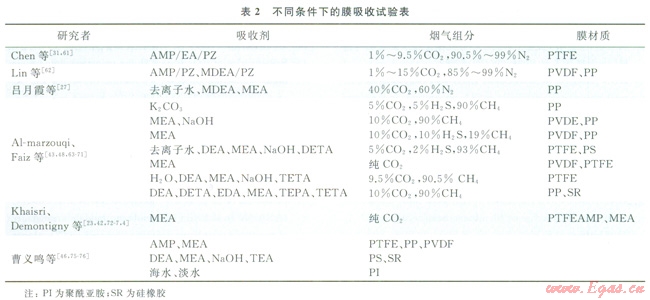 此外,由于單一吸收劑不能完全滿足高再生性能與高吸收速率,研究者們?cè)诨旌衔談┑奶剿髦腥〉昧溯^大進(jìn)展。常用的活化添加劑有醇胺、烯胺以及脂肪胺等。Wongrong等[58]發(fā)現(xiàn)在MEA中添加甘氨酸鈉溶液吸收效果有較大改善。Chen等[59]考察了6種不同配比的MEA/MDEA和PG/MDEA混合液,發(fā)現(xiàn)當(dāng)MDEA在混合液中比例為3:2時(shí),脫除效率可達(dá)99%,并且反應(yīng)更持久。楊波等[60]在氨基酸鉀中加入活化劑哌嗪(PZ)后,捕集濃度為15%的CO2模擬煙氣,CO2脫除率得到不斷提升。晏水平[53]通過大量實(shí)驗(yàn)研究了不同配比混合吸收劑的吸收與再生性能,發(fā)現(xiàn)在三級(jí)胺溶液中添加中等含量活化劑時(shí)性能最佳。表2總結(jié)了部分國(guó)內(nèi)外學(xué)者進(jìn)行膜吸收試驗(yàn)的條件及參數(shù)。綜上所述,MEA/TEA、PZ/TEA、MEA/MDEA、PZ/MDEA、MEA/AMP、PZ/AMP和PZ/DEA等混合吸收劑體現(xiàn)了良好的綜合性能。因此,采用具有高CO2吸收和再生性能的吸收劑組成的混合吸收劑理論上能獲得較好的CO2吸收與再生綜合性能。所以,在規(guī)?;瘧?yīng)用中,應(yīng)當(dāng)根據(jù)實(shí)際情況進(jìn)行適當(dāng)?shù)蛘?,確定最優(yōu)的活化劑種類與濃度,達(dá)到最佳吸收效果,找到一種高效吸收與再生的吸收劑。