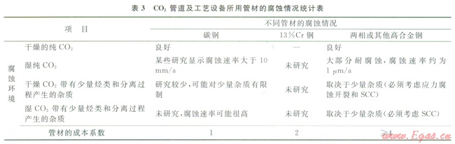 CO2管道及工藝設(shè)備所用管材的腐蝕情況統(tǒng)計結(jié)果見表3[6]。