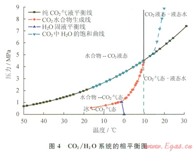 對管道安全運行影響最大的雜質(zhì)就是水。從大多數(shù)源頭捕獲的CO2混合氣體都含有一定量的水。實際含水量隨氣體來源不同而變化。例如,利用氨吸收法從煙道氣中捕集的CO2中含水量的體積分數(shù)通常超過5%。絕大部分的水在壓縮及脫水階段(常采用三甘醇)被脫除。而來自于煤氣化工藝的CO2通過低溫甲醇洗分離工藝,只含有0.0002%的水。