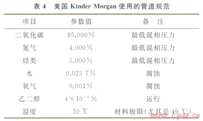 日前運行的管道中所輸送的CO2混合物及對純度和含水量的規(guī)定等都不盡相同。國際上對于管道系統(tǒng)輸送CO2混合氣體的組成要求沒有統(tǒng)一的標準?;旌蠚怏w的組成要求很大程度上取決于設(shè)計階段進行的評估,包括流動安全、管道完整性、安全性及終端用戶對CO2純度的需求。美國Kinder Morgan使用的管道規(guī)范見表4[12]。